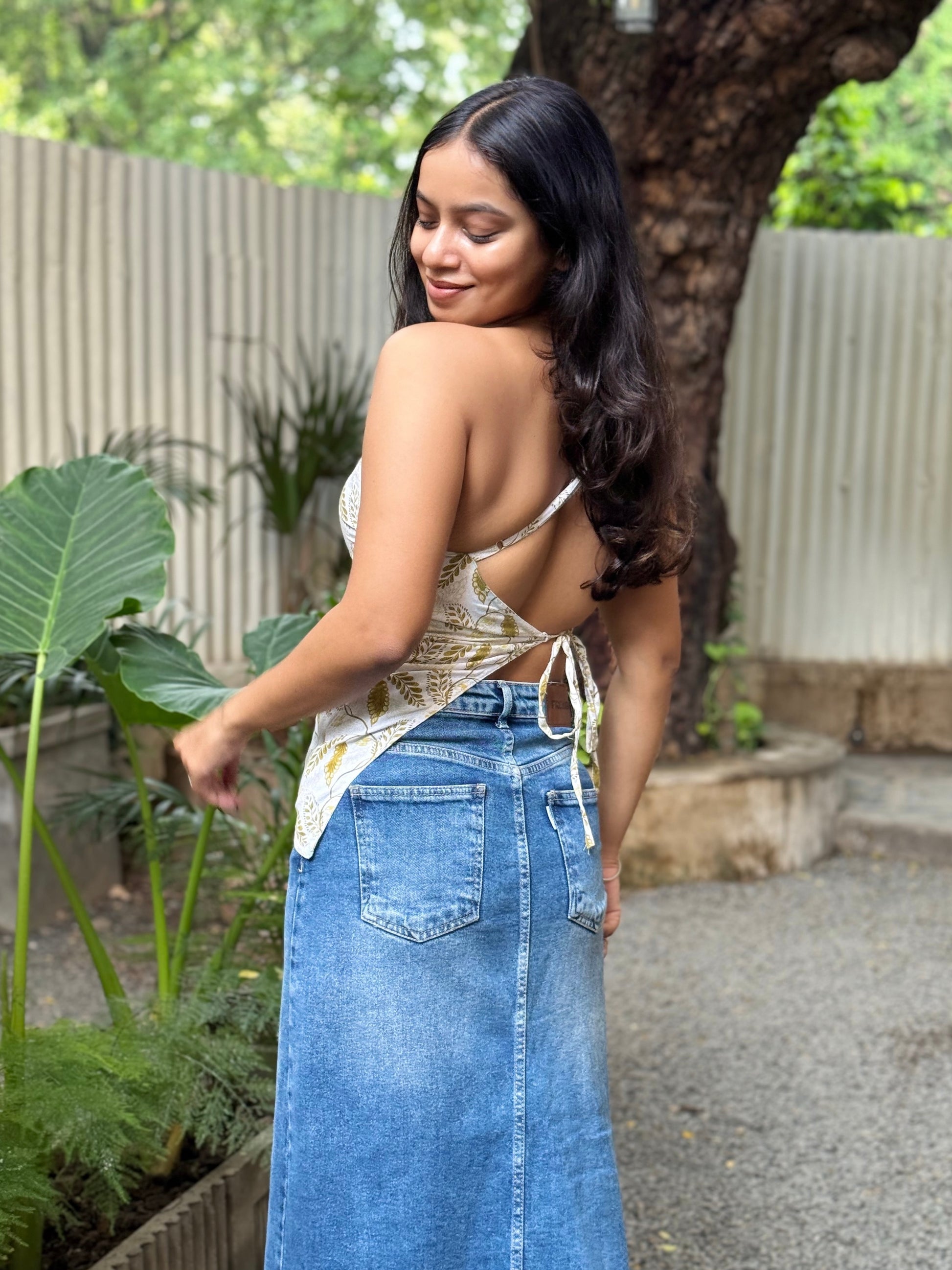 Bring a fresh, modern vibe to your wardrobe with our Elan Top, crafted from 100% breathable cotton. The one-shoulder neckline, asymmetric hemline, and tie-back strap give it a unique fusion of elegance and comfort. The subtle mustard leaf motifs on a white base make it versatile for both casual days and statement evenings.